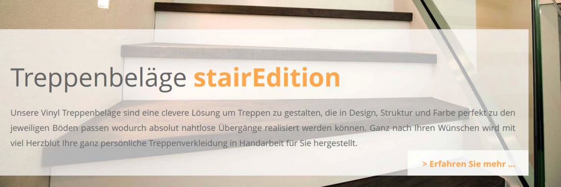 Unsere Vinyl Treppenbeläge sind eine clevere Lösung um Treppen zu gestalten, die in Design, Struktur und Farbe perfekt zu den jeweiligen Böden passen wodurch absolut nahtlose Übergänge realisiert werden können. Ganz nach Ihren Wünschen wird mit viel Herzblut Ihre ganz persönliche Treppenverkleidung in Handarbeit für Sie hergestellt.