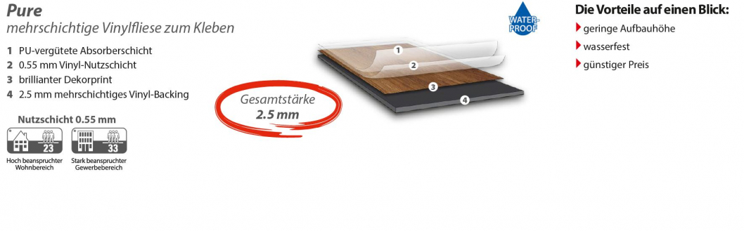 Unsere Vinylböden samurai eignen sich sowohl für den privaten Gebrauch, wie auch für Ihren Gewerbe-Einsatz. Sie sind mit ihrer 0,55 mm PU Nutzschicht der perfekte Bodenbelag bei hoher Beanspruchung.