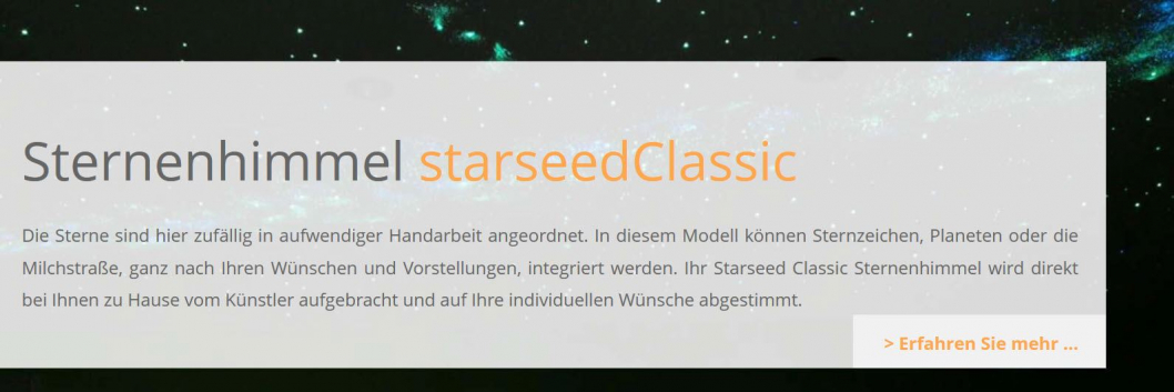 Die Sterne sind hier zufällig in aufwendiger Handarbeit angeordnet. In diesem Modell können Sternzeichen, Planeten oder die Milchstraße, ganz nach Ihren Wünschen und Vorstellungen, integriert werden. Ihr Starseed Classic Sternenhimmel wird direkt bei Ihnen zu Hause vom Künstler aufgebracht und auf Ihre individuellen Wünsche abgestimmt.