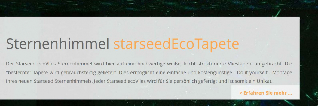 Der Starseed ecoVlies Sternenhimmel wird hier auf eine hochwertige weiße, leicht strukturierte Vliestapete aufgebracht. Die "besternte" Tapete wird gebrauchsfertig geliefert. Dies ermöglicht eine einfache und kostengünstige - Do it yourself - Montage Ihres neuen Starseed Sternenhimmels. Jeder Starseed ecoVlies wird für Sie persönlich gefertigt und ist somit ein Unikat.