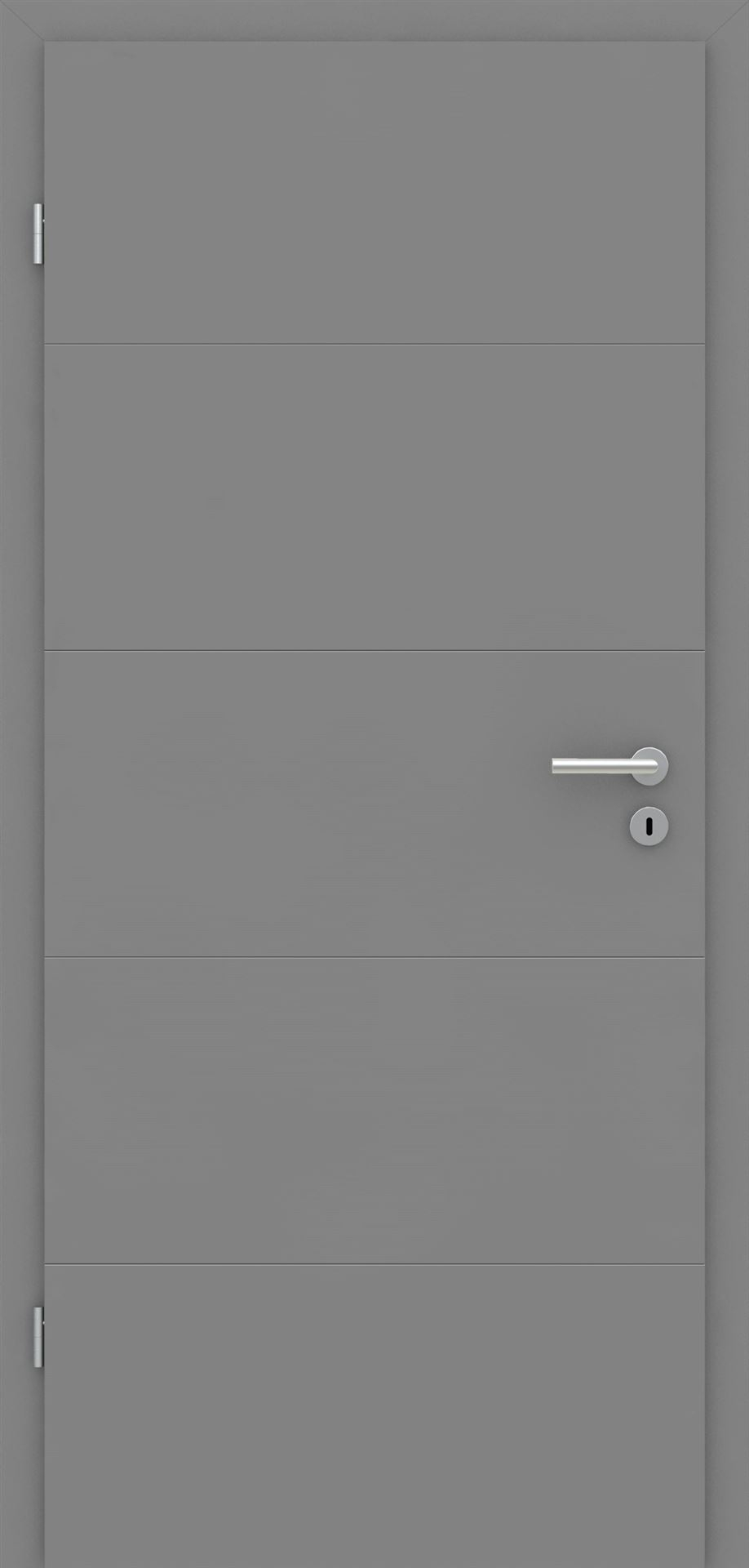 Entdecken Sie unser Meisterwerk des Designs: Die Mineralgraue Designtür Florenz besticht durch feinste Details und einzigartige Eleganz. Dezente 3mm breite Rillen verleihen ihr eine schlichte, aber erfrischende Optik und sorgen für eine harmonische Ästhetik. Der zeitlose Farbton Mineralgrau, ähnlich RAL 7037, setzt einen faszinierenden Blickfang, der die Liebe zum Grau weckt. Das Türblatt ist mit einer lackierten Oberfläche versehen, die das Design perfekt abrundet.
