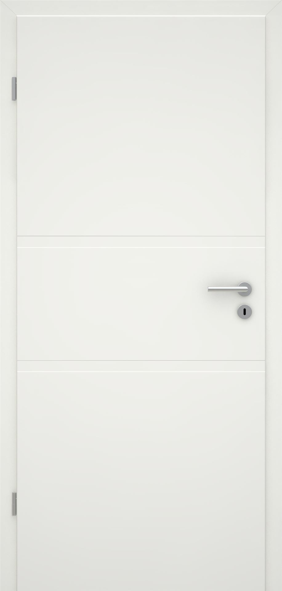 Schlicht und doch wirkungsvoll präsentiert sich unsere weiße Innentür mit hochwertiger Lackoberfläche in Weißlack 1.0, inspiriert von RAL 9010. Die modena Wohnraumtür besticht durch ihre breiten 40 mm Rillenfräsungen, die sie nicht nur dezent, sondern auch zu einem echten Blickfang machen. Mit ihrem rechtwinkligen Türblattkanten betont sie eine geradlinige und zeitlose Ästhetik, die jedes Raumkonzept perfekt unterstreicht.