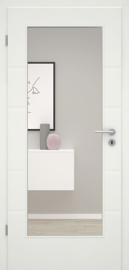 Die breiten Rillen mit 25 mm verleihen den Türen ein edles und dennoch schlichtes Design, perfekt für zeitgemäße Raumkonzepte. Kombinieren Sie ganz nach Ihren Wünschen mit passenden Lichtausschnitten oder Ganzglastüren.